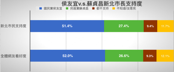 调查结果显示,民进党年底如果推派苏贞昌出征对决侯友宜,侯友宜在新北市依然能拿下51.4%的支持度,远胜苏贞昌的27.4%;此外,如果是游锡堃出征,恐怕也讨不到便宜,侯友宜依然拿下53.6%支持度,大胜游锡堃的28.2%。