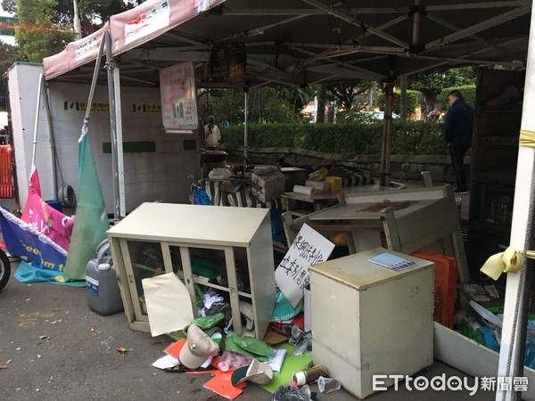 “独派”帐篷被国民党青年军泼漆砸毁。(图片来源:台湾“东森新闻云”)