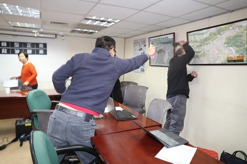 胡志伟表示,因自己头发有点少,会随身携带生发剂,今天和2位同伴刚好“路过”记者会,看到蔡丁贵头发少,就喷他生发剂,大概喷了5、6秒,但他一直闪身。
