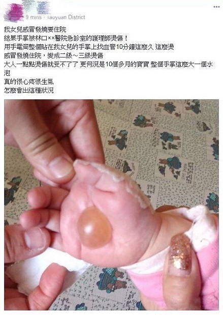 网友指称,十月大女儿因感冒发烧前往林口某医院住院治疗,护理师为了找寻女婴手上血管,使用手电筒贴在女婴手上长达十分钟,导致女童二到三级烧烫伤,手掌上更起了一个巨大的水泡,网友愤怒发文“怎么会出现这种状况?”