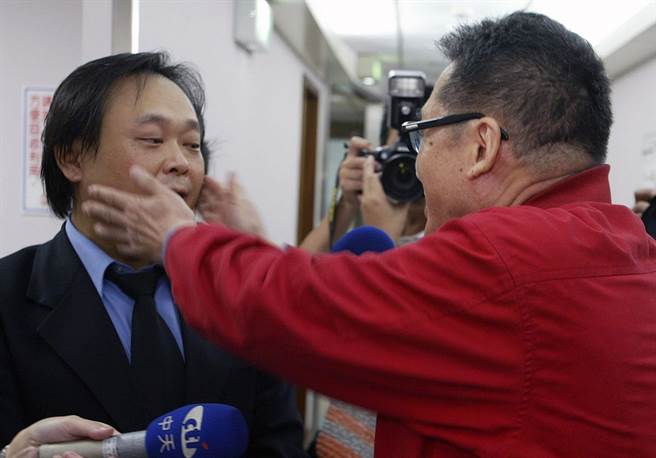 2005年,王世坚不满李敖言论影响个人名誉,到李敖办公室要找他理论,两人在走道上展开言语辩论,李敖摸着王世坚的脸颊说“小老弟,不要再闹了,肚子饿了,赶快回去吃饭吧!”(图片来源:台湾《中时电子报》)