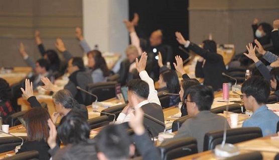 台大临时校务会议24日召开,出席的委员现场针对投票是否记名进行举手表决。(季志翔摄)
