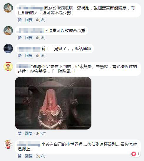 对于“神隐少女”蔡英文口中“你不知道我在接近你”的说法,网友贴出灵异少女的图片大呼,“见鬼了,鬼话连篇”、 “神隐少女”是看不到的;她来无影、去无踪,当她接近你的时候;你会觉得……“一阵阴风……”