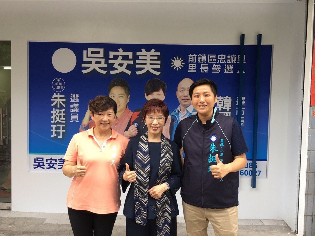 国民党前主席洪秀柱(中)为国民党高雄市议员参选人朱挺玗(右)和里长参选人吴安美加油打气。(图片取自台媒)