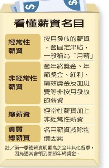 台经院景气预测中心主任孙明德说,所谓实质总薪资,除了企业支付员工的经常性薪资(即一般惯称的月薪)之外,还有红利、绩效、年节及年终奖金等非经常性薪资,但薪资和奖金不一样,因此他认为这两者应该分开看。
