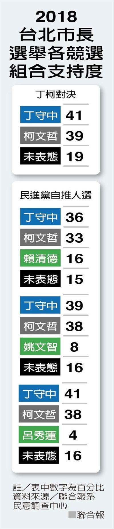 调查发现,民进党无论是推出姚文智、吕秀莲或赖清德代表绿营征战北市,目前都尚未撼动柯、丁两强对决态势,民进党想赢得北市选战,仍有相当努力空间。