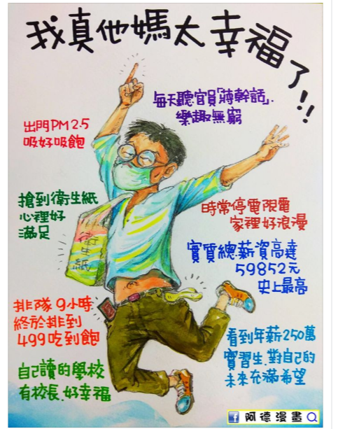 台湾漫画家阿德在脸书“阿德漫画”粉丝页发表最新讽刺漫画,并列举8项他认为近期内最幸福的事件,包含“每天听官员‘蒋干话’乐趣无穷”、“时常停电限电家里好浪漫”、“实质总薪资高达59852元(新台币,下同)史上最高”、“看到年薪250万元实习生对自己的未来充满希望”、“出门PM2.5 吸好饱”、“抢到卫生纸心里好满足”、“排队9小时终于排到499吃到饱”、“自己读的学校有校长好幸福”。
