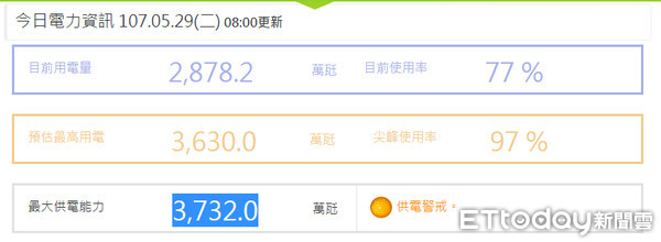 根据台电网站显示,昨天用电数据,尖峰用电出现在下午1点41分,最高用电量达3600.65万千瓦,创今年用电第1高,也创下历史5月用电第1高纪录。今日实际备转容量129.1万千瓦、实际备转率3.59%,持续亮出供电警戒的橘灯。