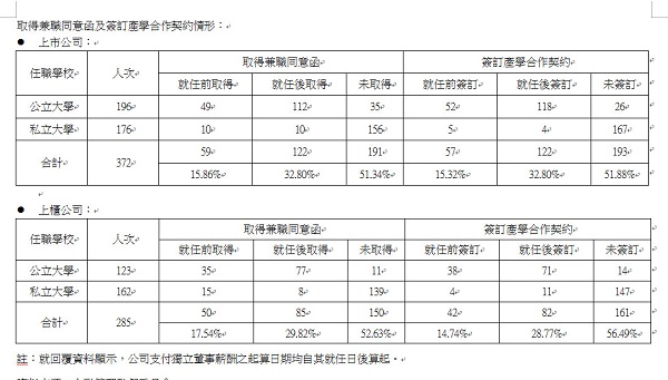 陈学圣表示,针对大专院校专任教师担任上市柜公司独立董事,是否取得兼职同意函及签订产学合作契约,“金管会”先前委托证交所、柜买中心,采问卷方式调查。根据调查,上市公司有聘任具大专院校专任教师身份之独立董事,共372人次,其中32.80%于就任后取得兼职同意函,而高达51.34%则未取得;于就任后签订产学合作契约者占32.80%,未签订者也高达51.88%。另外,于上柜公司兼任独立董事之具大专院校专任教师身份者有285位,其中29.82%于就任后取得兼职同意函,高达52.63%未取得;就任后签订产学合作契约者占28.77%,未签订者达56.49%。