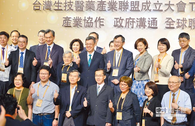 2017年台湾生技医药产业联盟成立大会,台湾地区副领导人陈建仁(中)应邀出席致词。(台媒资料照片)