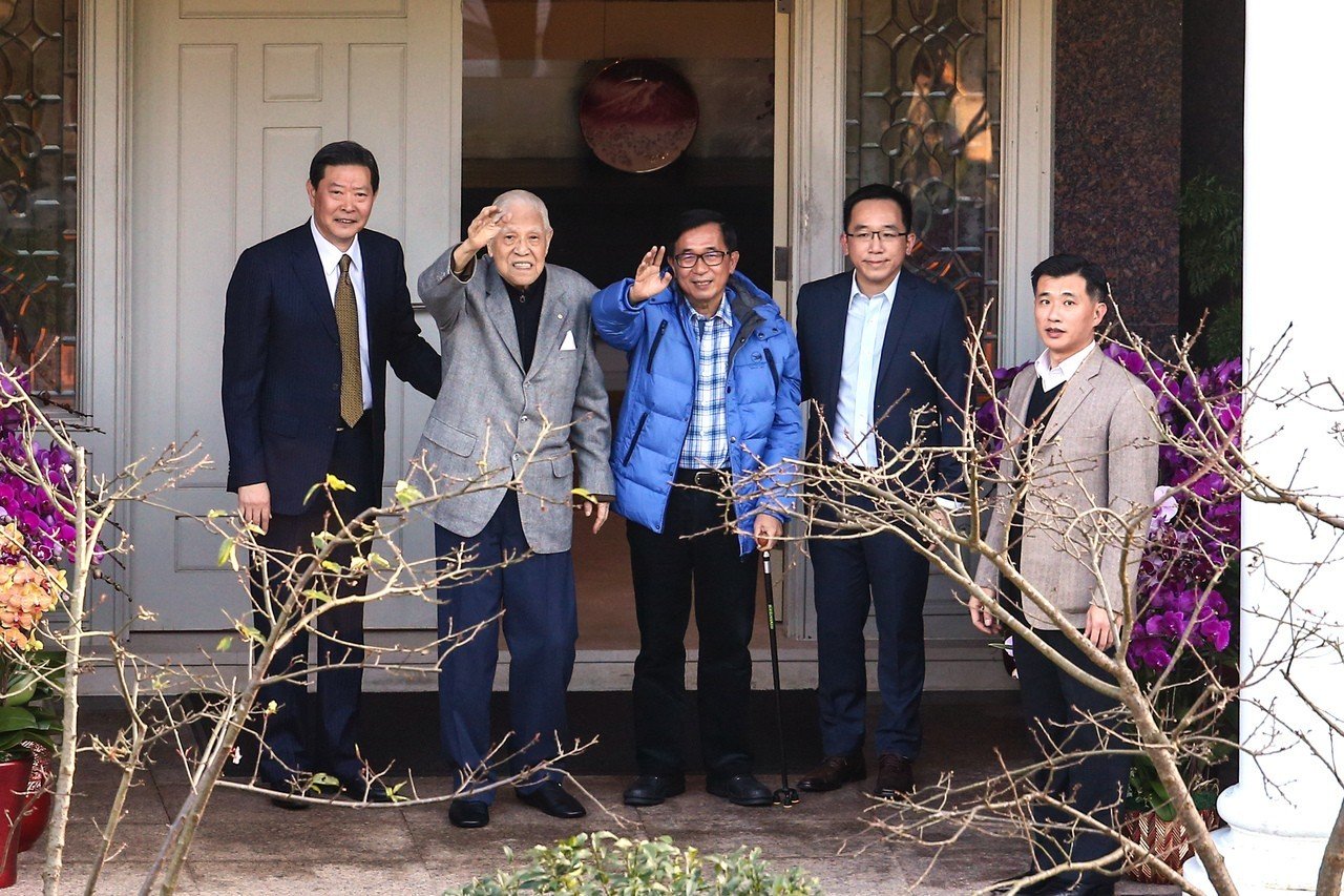 李登辉(左二)96岁大寿,陈水扁(中)与儿子陈致中(右二)为李祝寿。(图片来源:台湾《联合报》)