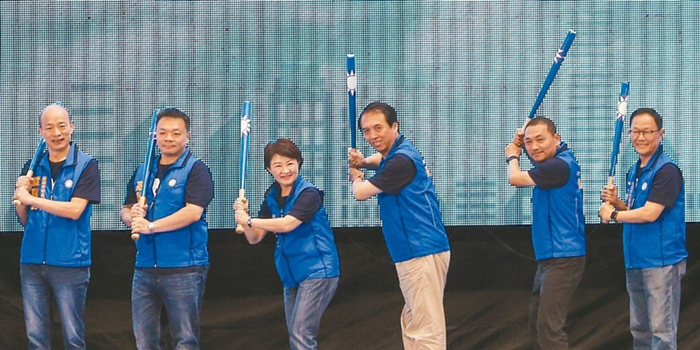 国民党“六都”市长参选人韩国瑜(左起)、高思博、卢秀燕、陈学圣、侯友宜、丁守中化身选手,做出挥棒动作,期许打出漂亮的胜选全垒打。(图片来源:台湾《联合报》)