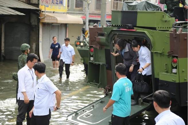 蔡英文25日搭云豹车到嘉义勘灾遭呛,后来她下车“撩水”勘灾。