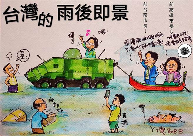 中国台湾网8月28日讯 据台湾“中时电子报”报道,823暴雨重击南台湾,多处水淹成灾引发民怨。台湾地区领导人蔡英文、台当局“行政院长”赖清德的勘灾行为,及“内政部长”徐国勇的发言引发许多争议。对此,阿德漫画在粉专上PO出讽刺漫画创作,以蔡英文搭云豹装甲车进入水灾区勘灾为主题,还找来赖清德、陈菊当配角暗讽时事。