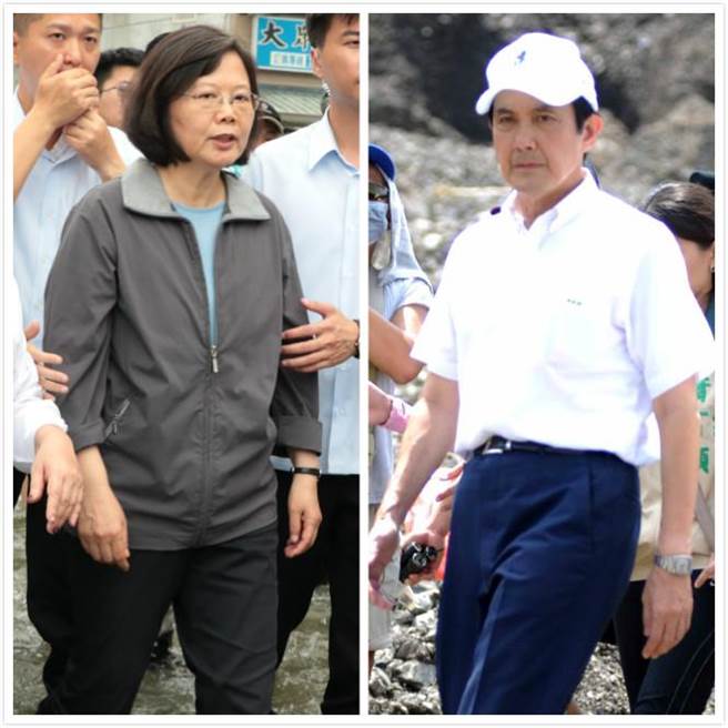 图为蔡英文(左)日前到嘉义勘灾、马英九(右)2009年视察屏东六龟乡新开部落灾区的开挖情形。(图片取自台媒)
