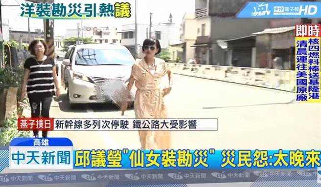 水灾过去13天后,邱议莹终于关心燕巢危屋,但一身飘逸长裙洋装外加时尚太阳眼镜出现,彷彿要去看秀,看到现场媒体还酸“太关心我了吧!”(图片来源:台湾中天新闻)