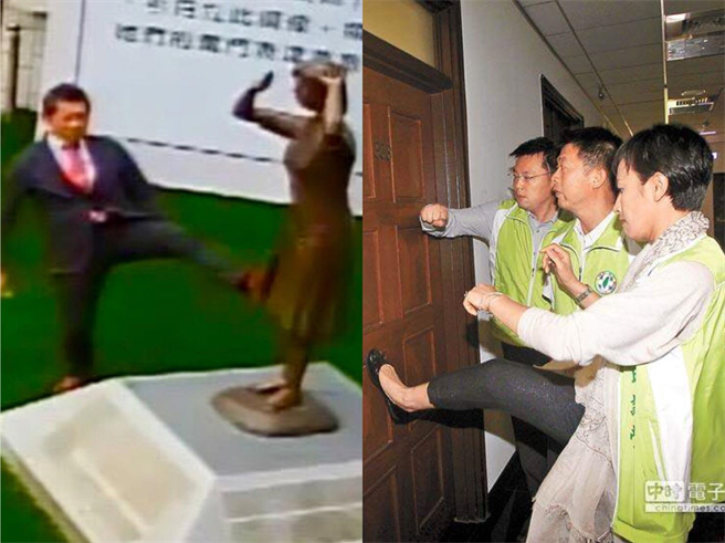 中国台湾网9月10日讯 据台湾“中时电子报”报道,台南市慰安妇人权平等促进会上月在国民党台南市党部旁竖立慰安慰铜像,日本抗议团体代表藤井实彦6日至台南时遭监视器拍下用脚狠踢慰安妇铜像画面。岛内名嘴谢寒冰在Facebook将藤井实彦与“绿委”邱议莹的照片对比,同样都是出脚狠踹,邱议莹的“屏东无影脚”曾直接踹破台当局前“法务部长”曾勇夫的办公室大门,似乎狠劲又略胜一筹。