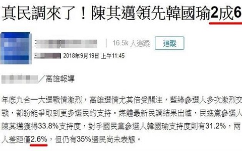 不过有一家媒体引述此民调时,内文虽正确写为“两人差距仅2.6%”,但标题却下成“真民调来了 陈其迈领先韩国瑜2成6”,亦即,标题把“2.6%”误会成“2成6”!