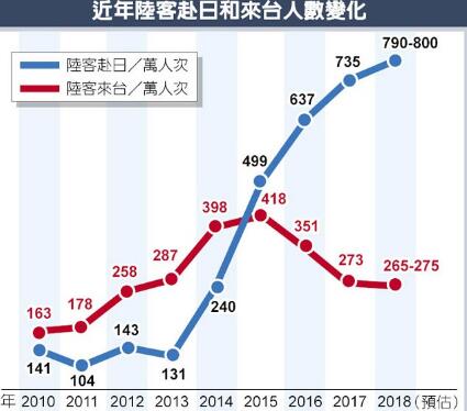 两岸关系急转直下,赴台大陆游客渐减,赴日陆客大增。2017年大陆游客赴日比赴台多462万人次,估计今年访日大陆游客可望上冲到790至800万人次,几乎是赴台的3倍。