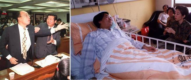 当年民进党“立委”陈水扁(图右)被时任“立委”的韩国瑜(图左一)打了一拳, 住进台大医院急诊,扁妻吴淑珍在床侧探视。韩国瑜回忆说,冲突导火线是因为扁说了有辱“荣民”的一句话。