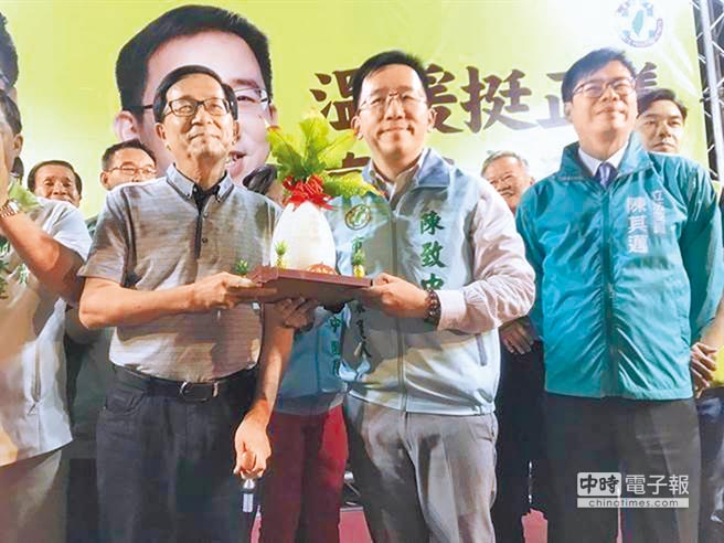 陈水扁决定10月28日为陈致中站台,“已有被抓回去的最坏打算”。图为去年扁公开替儿子陈致中(中)助选,送上好彩头祝福。(图片来源:台湾“中时电子报”)