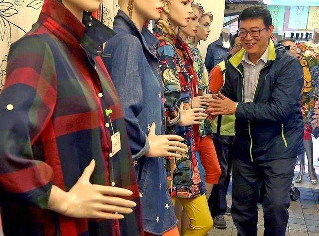 姚文智先前到城中市场和附近商圈拜票,看到整排卖衣服用的假人模特儿,玩性大发向它们一一握手致意。(图片来源:台湾《中时电子报》)