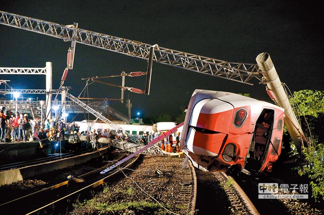 普悠玛列车于新马车站出轨,5个车厢翻覆,5、7、8节倾覆最严重,但台铁说普悠玛经特检没问题。(图片来源:台湾“中时电子报”)