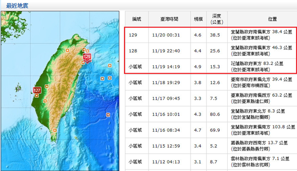 东部海域10小时连3地震,规模分别是4.9级、4.4级、4.6级。(图片取自台媒)