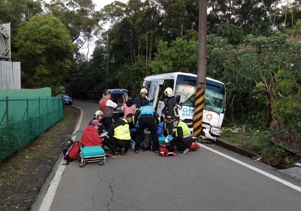 新北免费巴士自撞电线杆,车上都是年迈的阿公、阿嬷,救护车迅速赶抵协助送医。(图片来源:台湾《联合报》)