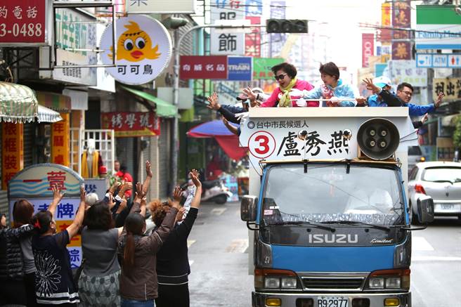 新科台中市长卢秀燕车队谢票,民众热情挥手致意。(图片来源:台湾“中时电子报”)