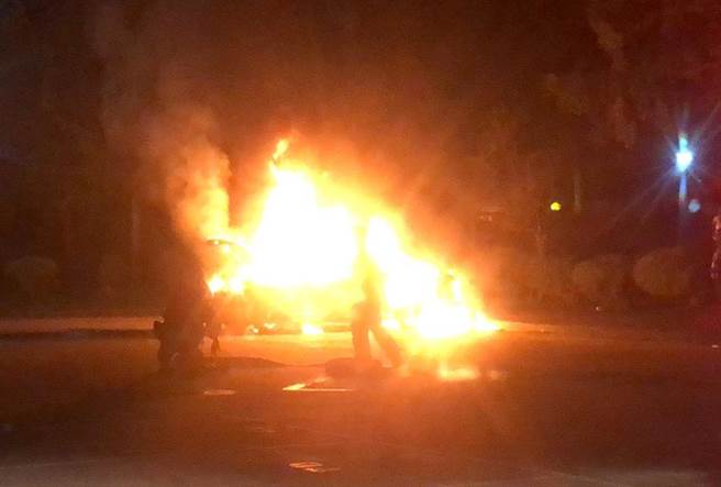 孙中山纪念馆停车场一辆汽车燃烧,火势猛烈。(图片来源:台湾“中时电子报”)
