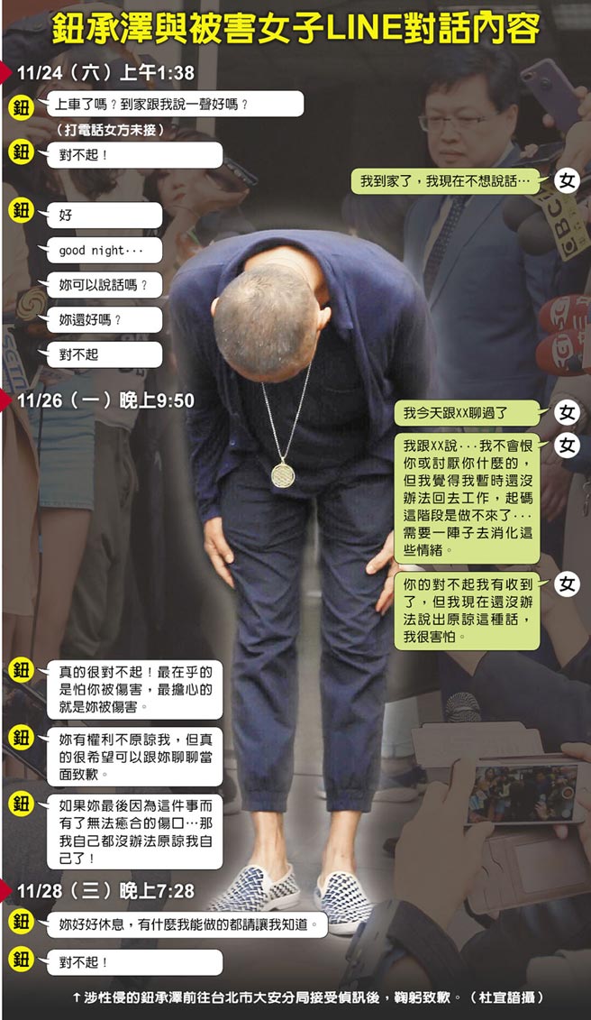 11月23日晚间钮对被害人性侵后,11月24日凌晨1时许两人对话出现变化,似乎关系急转直下。钮不仅要被害人到家跟他说一声,还急切地打电话及道歉,被害女子回答“我现在先不想说话”,钮至隔天仍不断留言询问“你还好吗?对不起”。