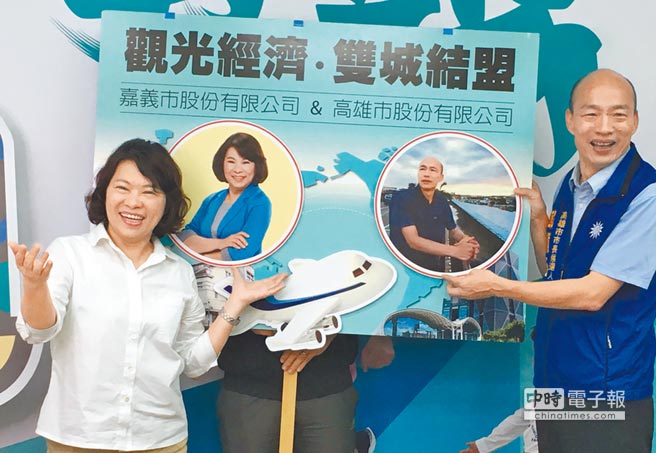 准嘉义市长黄敏惠(左)、准高雄市长韩国瑜于竞选期间提出双城共同拼经济的理念。(图片来源:台湾“中时电子报”)