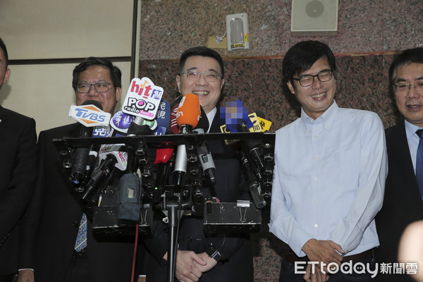 郑文灿(右二)等人推举卓荣泰(中)选民进党主席,引吴乃仁怒退党。(图片来源:台湾“东森新闻云”)