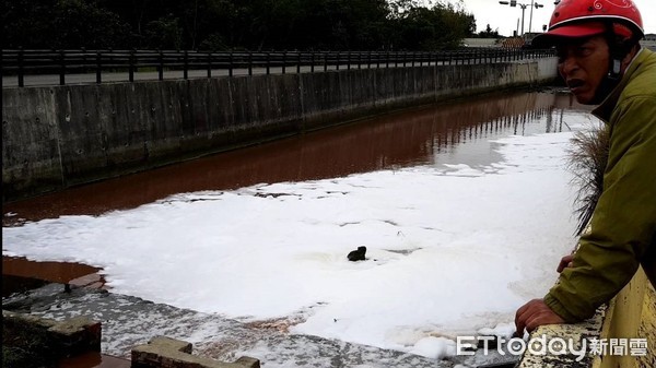 海水川桥下的溪水出水口处弥漫着久积不散的白色泡泡。(图片来源:台湾“东森新闻云”)