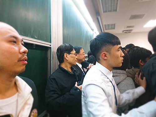 江宜桦被学生包围在讲台前无法离开,现场气氛火爆至极。(图片来源:台湾“中时电子报”)