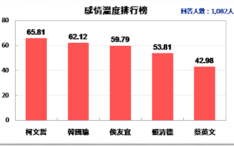中国台湾网12月24日讯 据台湾《工商时报》报道,亲绿的“台湾民意基金会”今天公布台湾民众对主要政治人物的感情温度,以台北市长柯文哲的温度最高、其次是高雄市长当选人韩国瑜,被列为“反感”的蔡英文则是敬陪末座,意味着已经被民意打入冷宫。