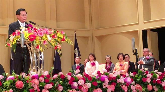 嘉义市卸任市长涂醒哲(左)致词酸言酸语,新科市长黄敏惠(右中白衣女子)及观礼者淡定。(图片来源:台湾“中时电子报”)