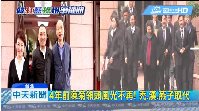 中国台湾网12月28日讯 据台湾《中国时报》报道,岛内“九合一”选举改写蓝绿政治版图,“六都”市长昨(27日)首度出席台当局“行政院会”。蓝营北、中、南大捷,2015年绿营“四都”首长风光出席“行政院会”的场景不在,取而代之的是“北神探”新北市长侯友宜、“中燕子”台中市长卢秀燕、“南菜贩”高雄市长韩国瑜,新首长要钱、要建设,绿营2020执政保卫战岌岌可危。