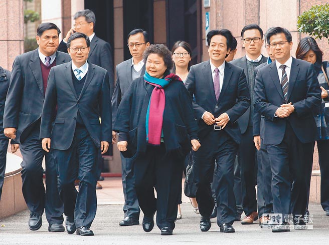 2015年陈菊率赖清德、郑文灿、林佳龙等“直辖市长”步出“行政院”,意气风发。(图片来源:台湾“中时电子报”)