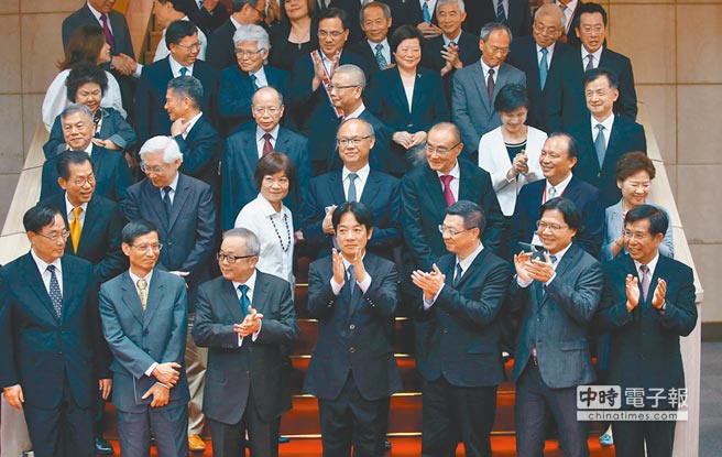 面对蔡英文元旦假期全力慰留,赖清德仍去意坚定。图为2017年交接典礼后,赖清德率时任“阁员”合影。(图片来源:台湾“中时电子报”)
