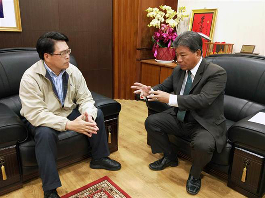 参与民进党主席补选的“台湾民意基金会”董事长游盈隆拜会台南市议长郭信良。(图片来源:台湾“中时电子报”)