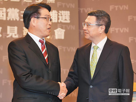 民进党第16届党主席补选电视政见发表会4日举行,前台当局“行政院秘书长”卓荣泰(右)与“台湾民意基金会”董事长游盈隆(左)会前相互握手致意。(图片来源:台湾“中时电子报”)
