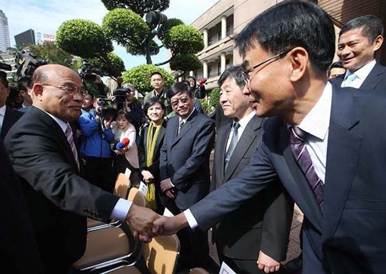 “行政院长”苏贞昌团队14日宣誓就职,苏贞昌(左)与 “农委会主委”陈吉仲(右)等“阁员”握手打气。(图片来源:台湾“中时电子报”)