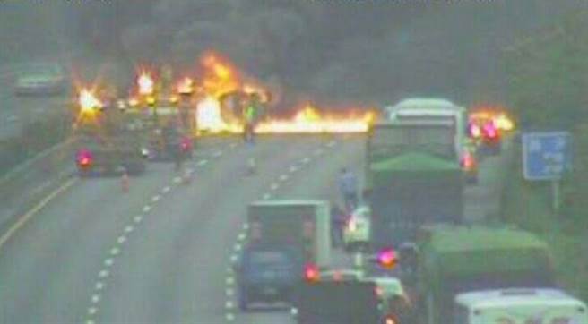 消防队赶到现场时整台小火货车已经陷入火海,火势从内侧及中线车道延烧至外侧车道,由于正值上班交通高峰时间,该路段严重受阻约半个多小时,目前仅开放车辆路肩通行。