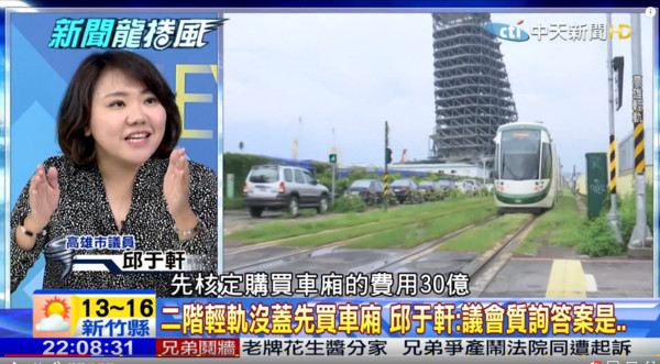 “车厢已经进来了!”邱于轩表示,前高雄市府直接通过台当局核定购买车厢的30亿的费用,且第一阶的轻轨车厢是西班牙制,二阶则是法国制,两种能否接还不一定。由于车厢已经付钱,她之前也在议会质疑道“先买车厢干嘛?”“民众都还没讨论好,市府硬要蛮干”。