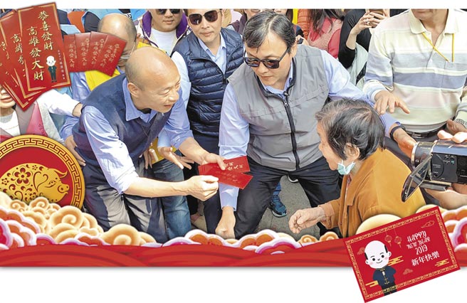 高雄市长韩国瑜(左)见到长者前来,贴心弯腰发送红包。(图片来源:台湾“中时电子报”)