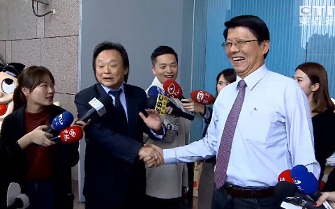 王世坚巧遇谢龙介!一秒尴尬握手“我有扶龙命格,不能骂他”。(图片来自台媒)