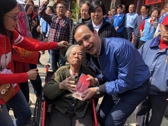朱立伦2日到新竹市关帝庙上香祈福,并向民众拜年同时发放红包,现场数千支持民众挤爆周遭道路。(图片来源:台湾“中时电子报”)