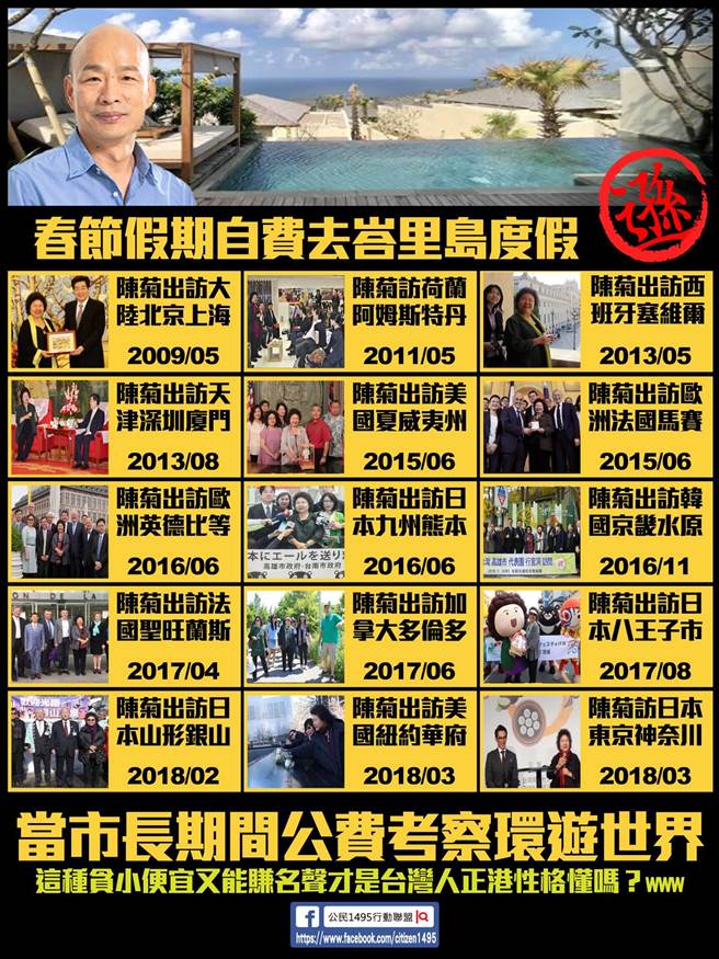 对比陈菊公费出境记录 韩国瑜自费去巴厘岛逊爆了!